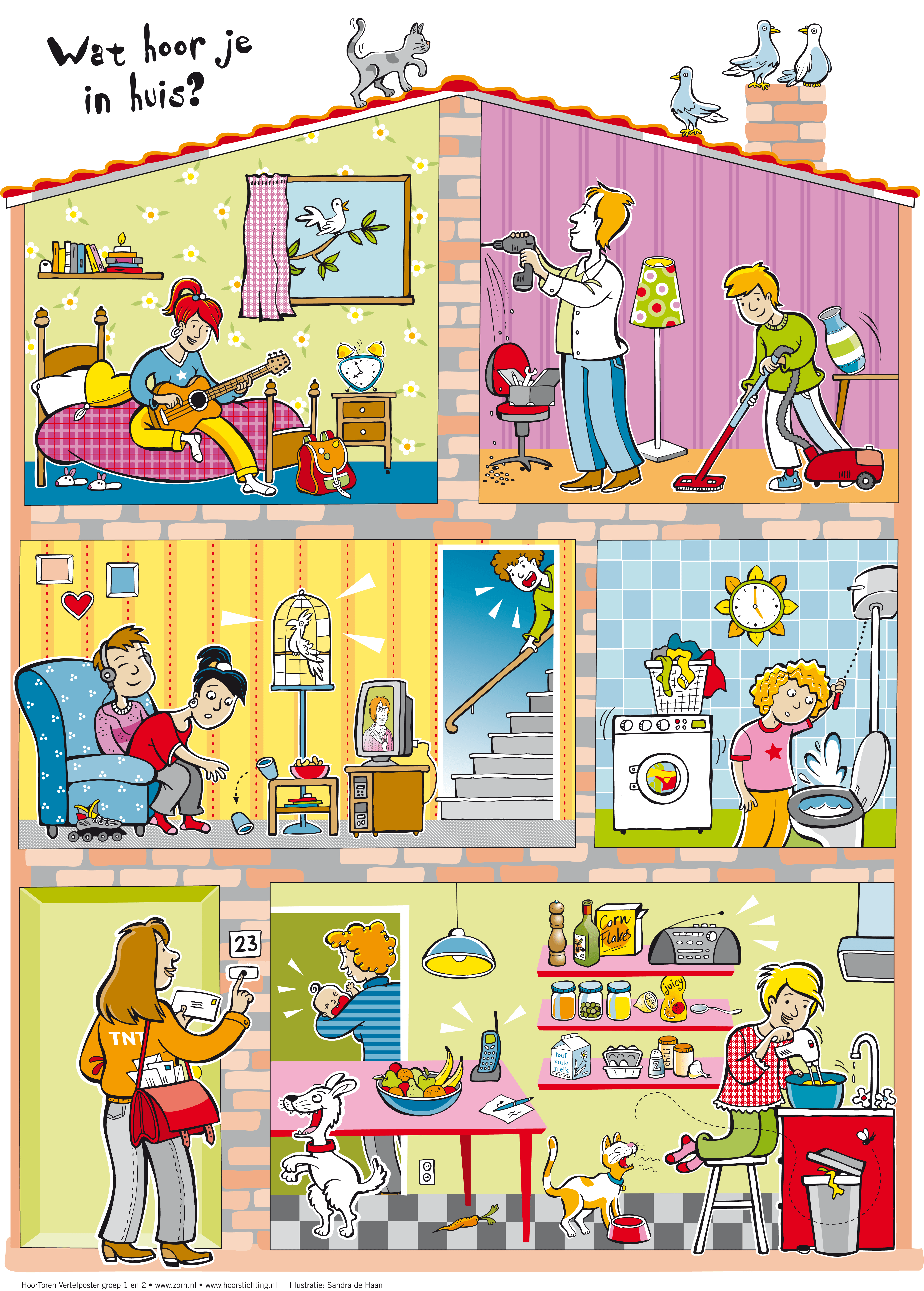 In deze les wordt de poster "Wat hoor je in huis?" besproken met de leerlingen. Wat zie je? Welke geluiden zie je? Vervolgens ga je met de leerlingen aan de slag met het maken van een geluidenverhaal.